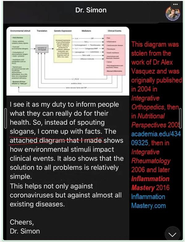 You can see my publication from 2005 in which I clearly was the originator of this diagram: Vasquez A. Nutritional and Botanical Inhibition of NF-kappaB, the Major Intracellular Amplifier of the Inflammatory Cascade. A Practical Clinical Strategy Exemplifying Anti-Inflammatory Nutrigenomics” published in Nutritional Perspectives 2005