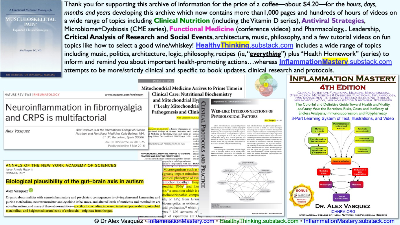 ….on a wide range of topics including Clinical Nutrition (including the Vitamin Dseries of Videos and Scientific Publications), Antiviral Strategies, Microbiome+Dysbiosis (CME series of >12 videos), Functional Medicine (conference videos) and Pharmacology (of Vitamin B12 and Pediatric Injections,.. Leadership, Critical Analysis of Research and Social Events, architecture, music(Celibidache), philosophy, and a few tutorial videos on fun topics like how to select a good wine/whiskey (and minimize the risks)! HealthyThinking.substack.comincludes a wide range of topics including music, politics, architecture, logic, philosophy, recipes (ie, “everything”) plus “Health Homework” (series) to inform and remind you about important health-promoting actions…whereasInflammationMastery.substack.com attempts to be more/strictly clinical and specific to book updates, clinical research and protocols.